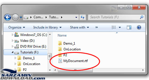 همانطور که می بینید به نظر میرسد که فایل هیچ پسوندی ندارد در حالیکه ما می دانیم نام دقیق این فایل "MyDocument.rtf" است. علت این امر آنست که ویندوز به طور پیش فرض به نحوی تنظیم شده است که پسوند فایلها را پنهان سازد. پس برای به نمایش در آوردن پسوندها از طریق منوی Organize گزینه Folder and Search Options را فعال کرده، وارد نوار View شده و تیک گزینه "Hide extensions for known file types" را بر دارید (در ویندوز XP این عمل از طریق منوی Tools و گزینه "Folder Options" قابل انجام است)